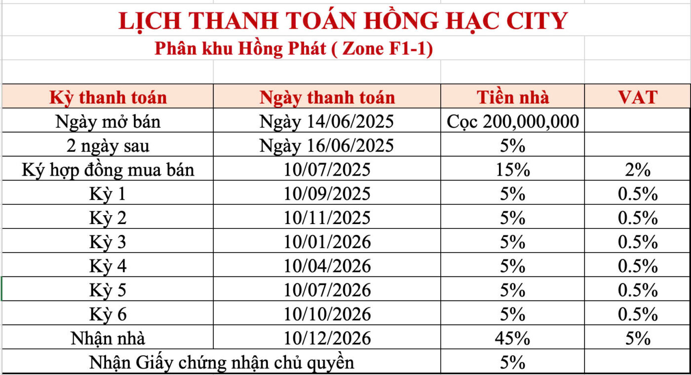 Lịch Thanh Toán Dự Kiến Hồng Hạc City