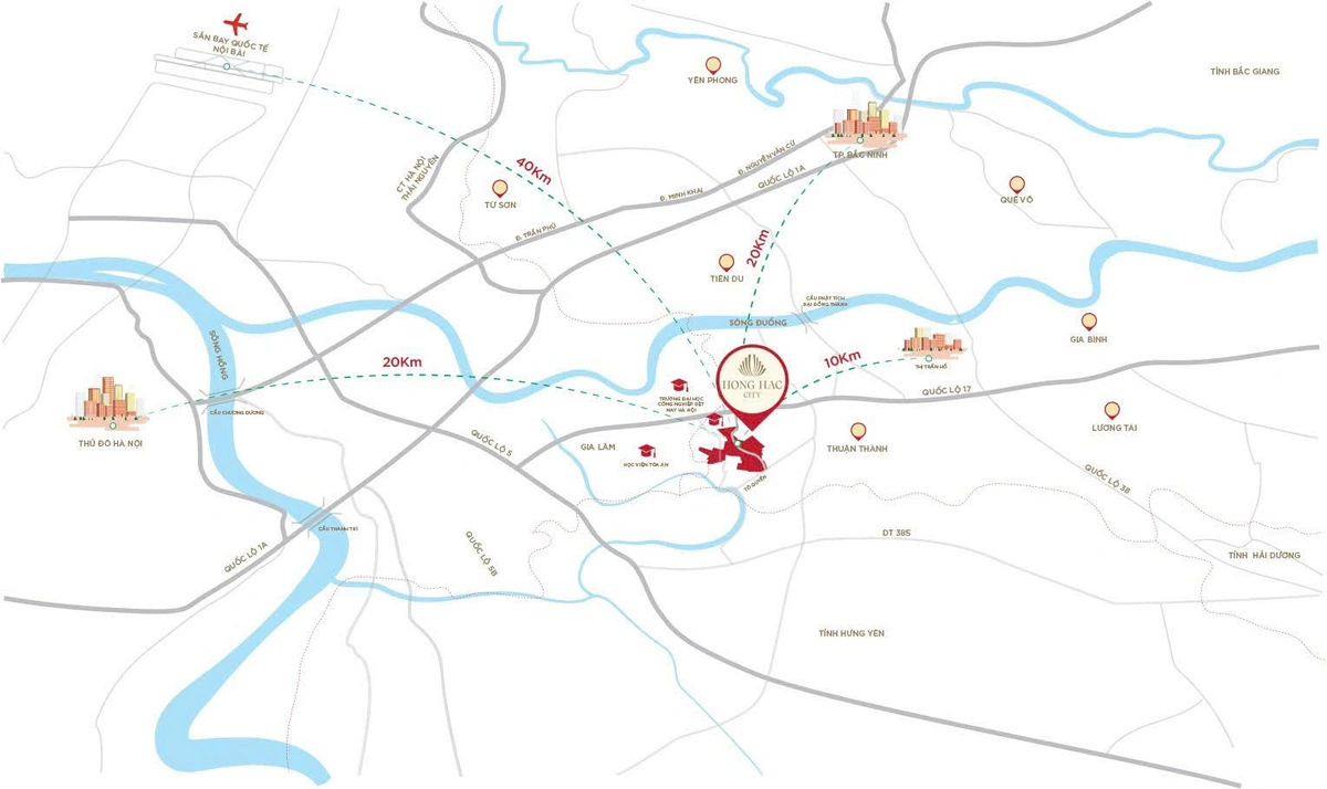 Hồng Hạc City – biểu tượng mới của đô thị sinh thái phía Bắc, là siêu dự án quy mô lớn tọa lạc tại huyện Thuận Thành, tỉnh Bắc Ninh, trải dài trên ba xã Ngũ Thái, Song Liễu và Xuân Lâm. Được quy hoạch trên tổng diện tích gần 200 ha, dự án mang tầm nhìn kiến tạo một không gian sống chuẩn mực – nơi hiện đại giao hòa cùng thiên nhiên.