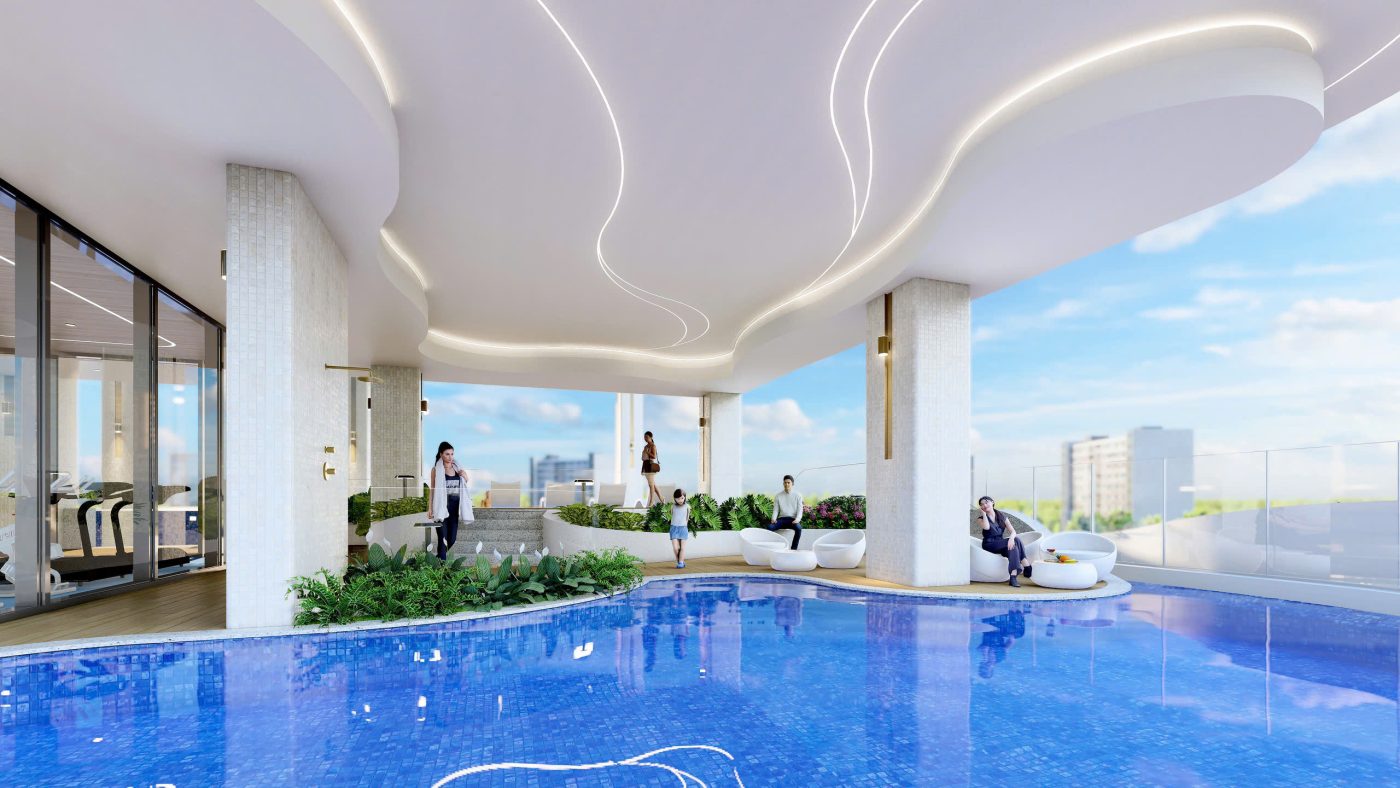 Hồ bơi tràn bờ nước mặn: Điểm nhấn thư giãn sang trọng, tái hiện không khí nghỉ dưỡng ngay giữa lòng đô thị.